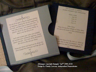 First the tool box version. Tim has a red craftsman tool box and I thought the briefcase on board journals could easily be adapted to look like a toolbox. To do this you need: Real Red, Basic Black, Whisper White, Very Vanilla and Going Gray (I think) card stocks, Smooch Spritz, Briefcase On Board Journals, Brads, Round Label Punch, Versamark, Real Red Classic Stamp Pad,Teeny Tiny Wishes, and Totally Tool.